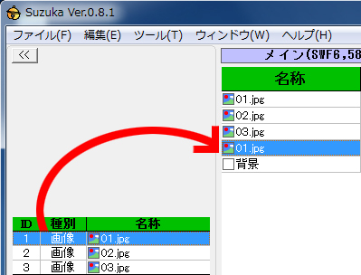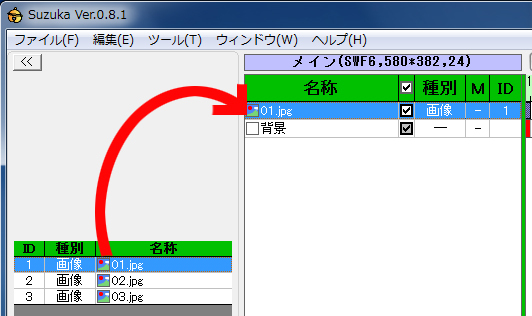 メインウィンドウの「01.jpg」と「背景」の間に2番目の画像を入れます。
