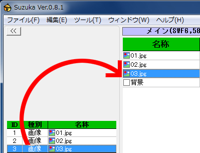 メインウィンドウの「03.jpg」と「背景」の間に1番目の画像を入れます。
