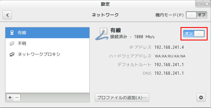 「オン」にします。ルータからDHCPにて正しくIPアドレスが取得できれば