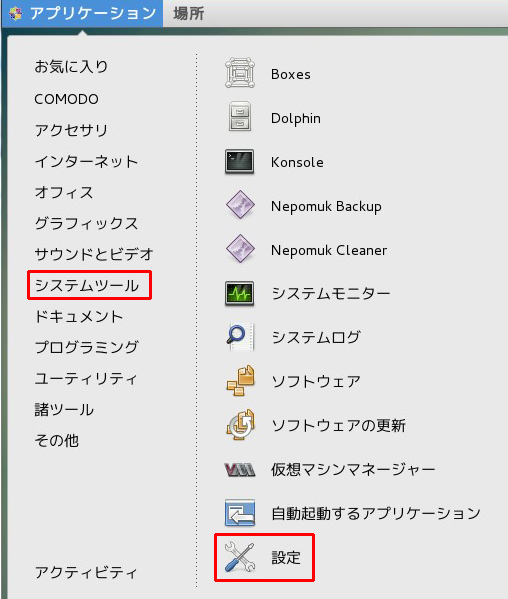 「アプリケーション」→「システムツール」→「設定」をクリックします。