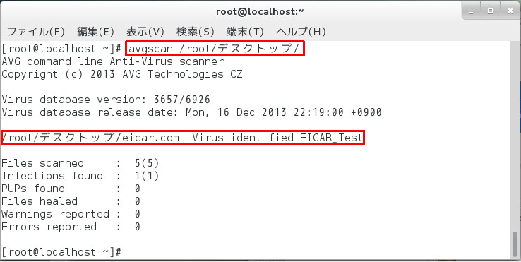 まず、/tmpディレクトリと/tmp/aディレクトリにテストウィルスファイル 「eicar.com」を置きました。