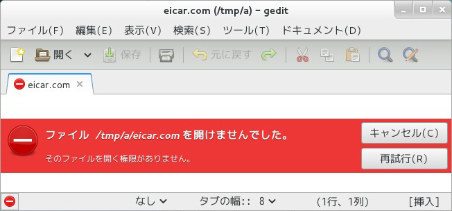 /tmp/aディレクトリのeicar.comを開いたところ。 「ファイル/tmp/a/eicar.comを開けませんでした。 そのファイルを開く権限がありません。」と表示されました。