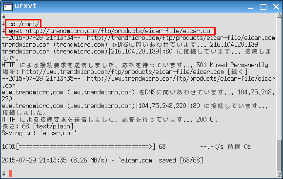 まずは/rootディレクトリへ移動し、テストウィルスファイルのeicar.comを