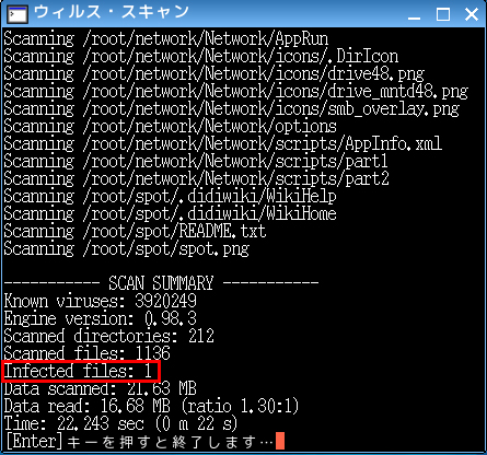 portable-0.2/clamav/virus」ディレクトリへ自動で移動しましたので
