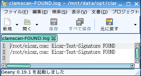 検知された感染ファイルのログは、clamscan-FOUND.logに都度、追記されていきます。