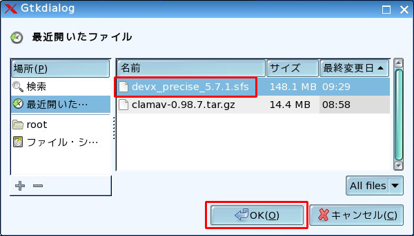 「devx_precise_5.7.1.sfs」を選択し、「OK」をクリックします。