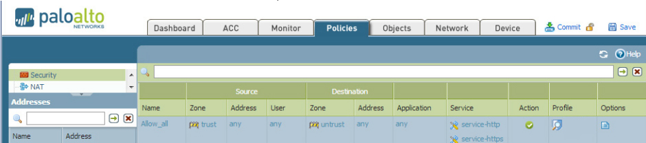 送信先(ゾーン名、アドレス)、アプリケーション、サービス、アクション、
