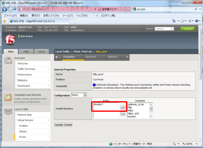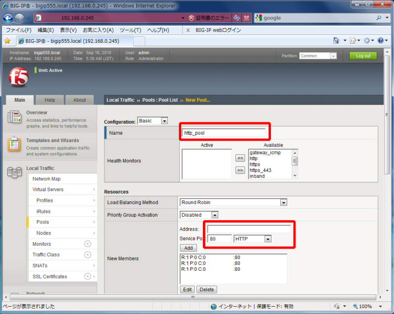 最初に設定した方のBIG-IP(UnitID 1)へwebログインします。