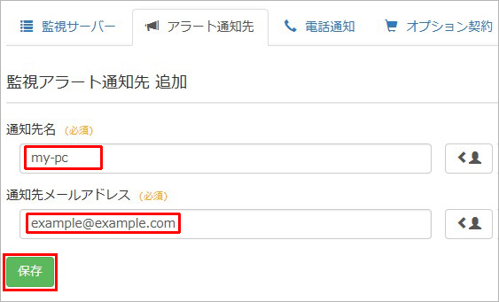 「通知先名」と「通知先メールアドレス」を入力し、「保存」をクリックします。