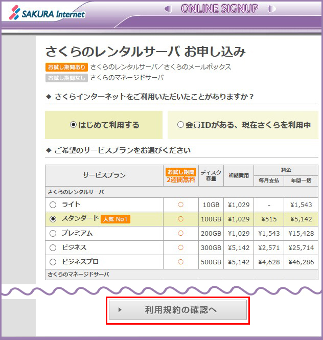 さくらインターネットのさくらのレンタルサーバの申し込み方法です。