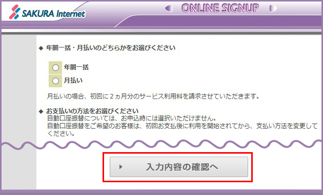 支払い方法などを選択、記入し「入力内容の確認へ」をクリックします。
