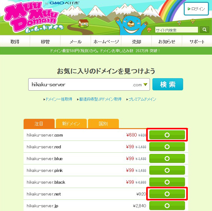 以下のように「○」と表示されていれば、そのドメイン名は使用できますので