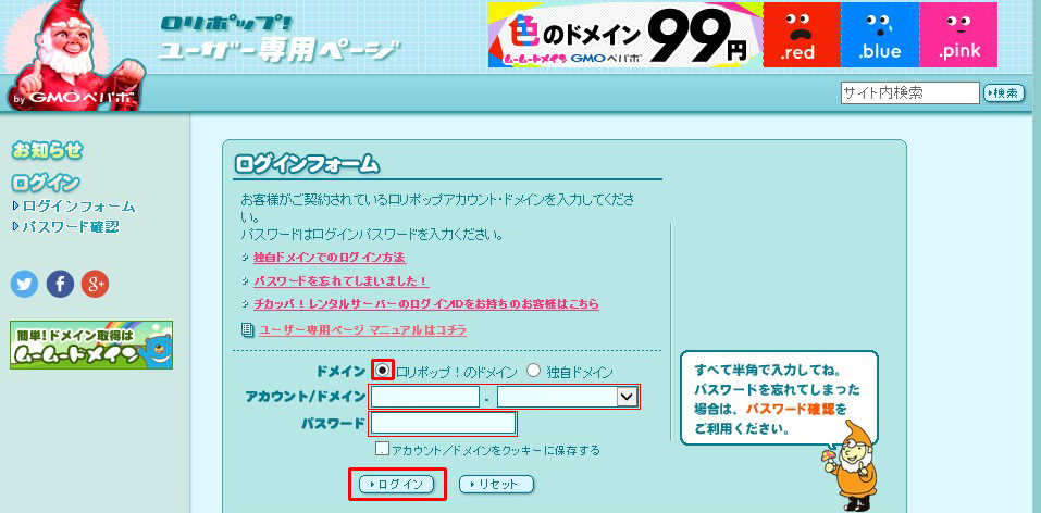 ロリポップのドメイン!にチェックを入れ、ドメインとパスワードを入力し