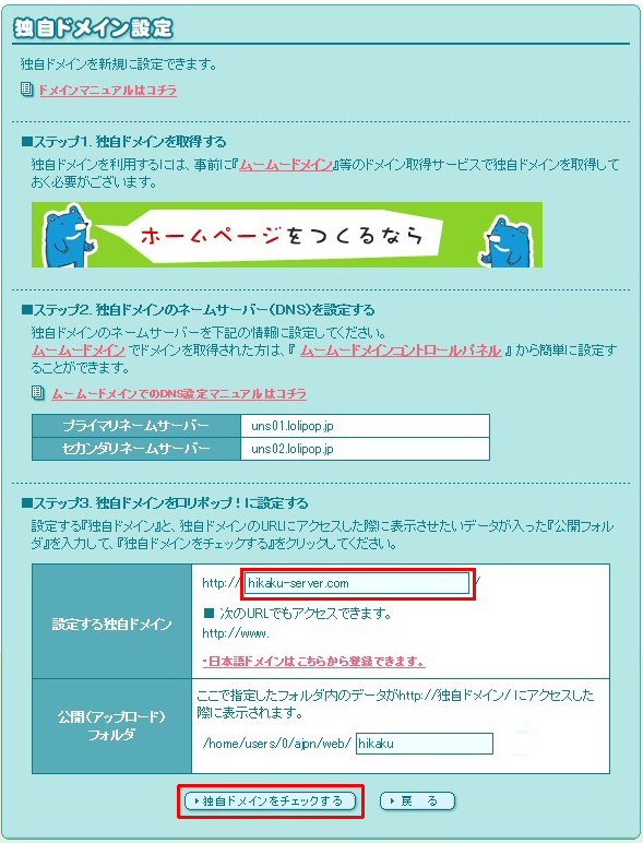 取得したドメインを入力し「独自ドメインをチェックする」をクリックします。