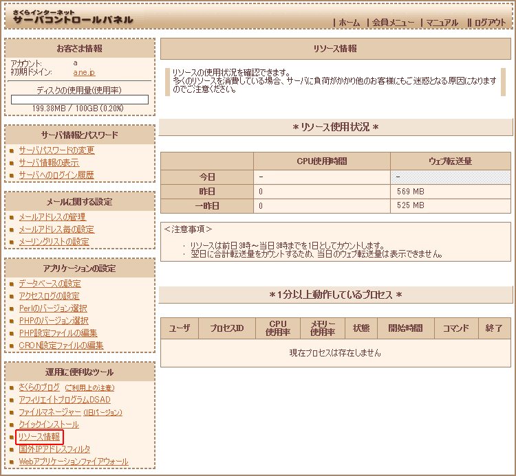 さくらのレンタルサーバでのディスク使用量と転送量の確認方法です。