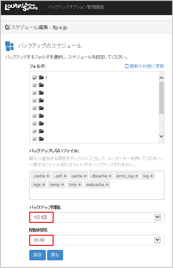 バックアップ間隔と、開始時間を選択し「保存」をクリックし完了です。
