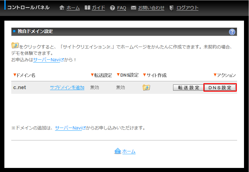 「DNS設定」をクリックします。