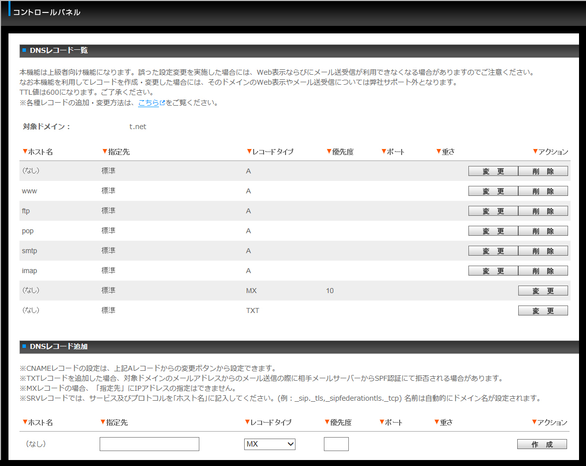 お名前.comの共用サーバSDでのDNSレコード編集方法です。A、MX、TXT、CNAME、SRVの5つのレコード編集が出来ます。