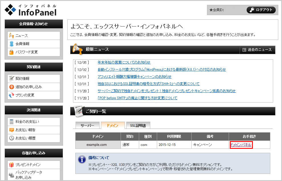 エックスサーバのインフォパネルへログインし左ウィンドウの