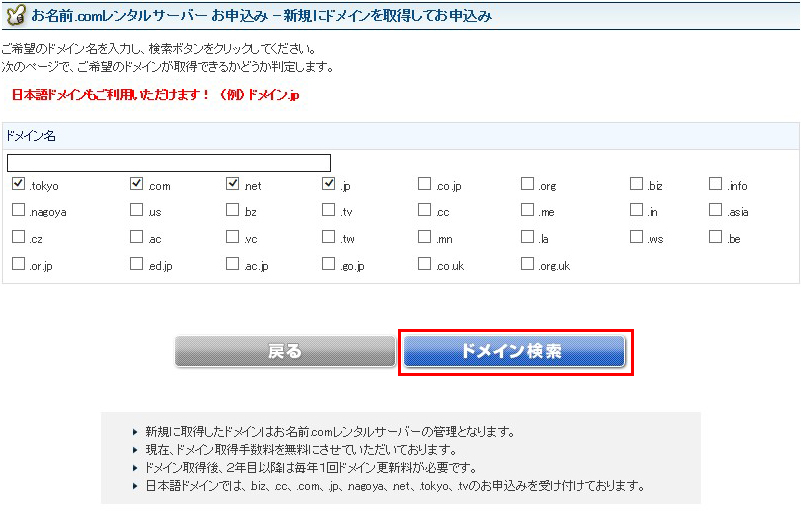 取得したいドメイン名を入力し「ドメイン検索」をクリックします。