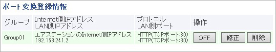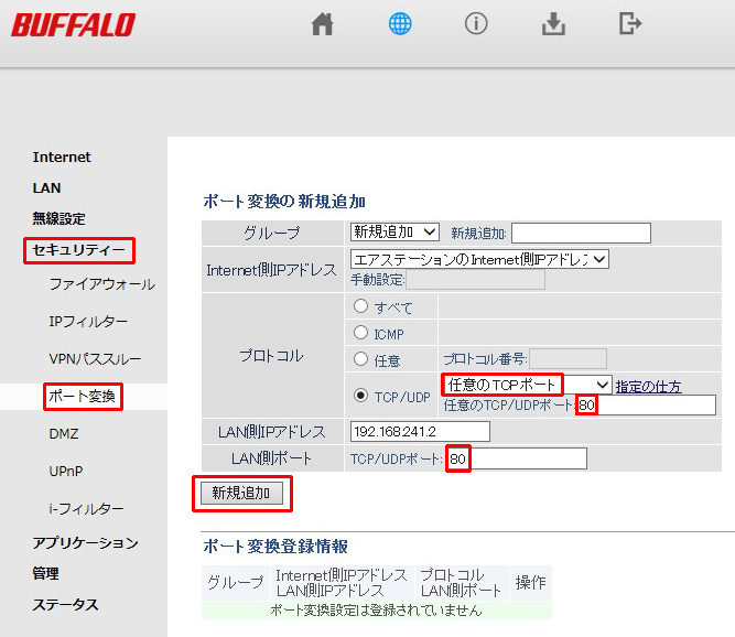 「セキュリティ」→「ポート変換」の「ポート変換の新規追加」で