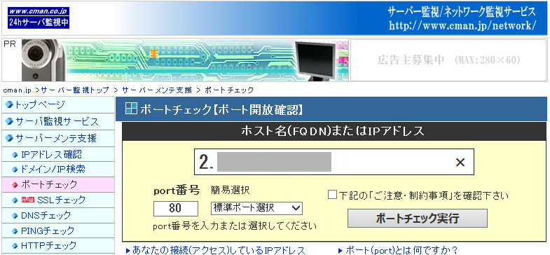 そのグローバルIPアドレスのtcp/80に対してCMANのポートチェックを行います。
