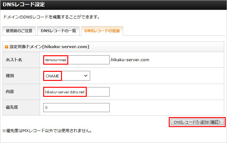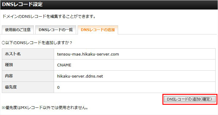 ※「優先度」はMXレコードの場合のみ有効になる機能です。