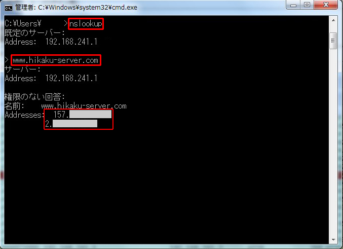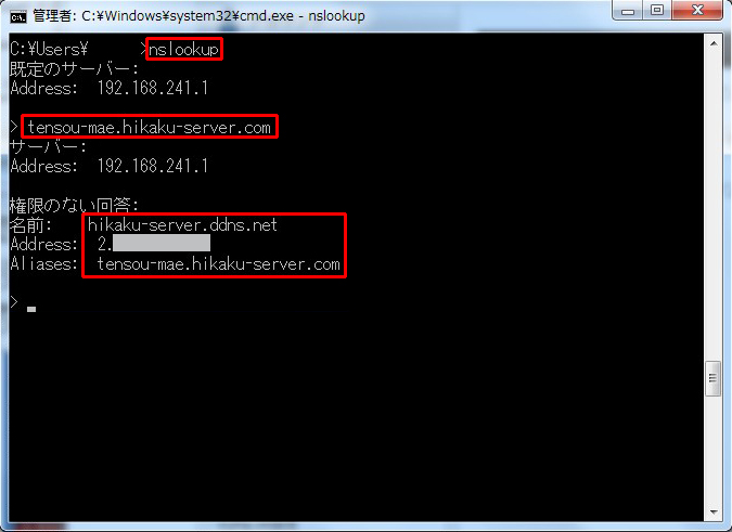nslookupで確認すると、正しく設定出来ていることが分かりました。