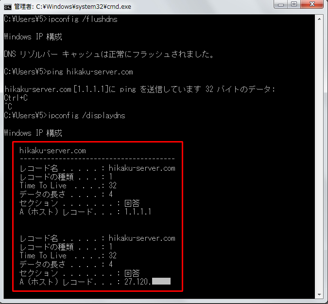 とし、パソコン(リゾルバ)のコマンドプロンプトでipconfig /flushdnsでDNSキャッシュを
