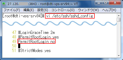 「#PermitRootLogin yes」の下行に「PermitRootLogin no」を追加しました。