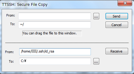 「ファイル」→「SSH SCP」からid_rsaを受信します。