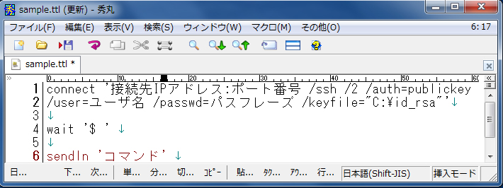 connect '接続先IPアドレス:ポート番号 /ssh /2 /auth=publickey /user=ユーザ名 /passwd=パスフレーズ /keyfile="C:\id_rsa"'