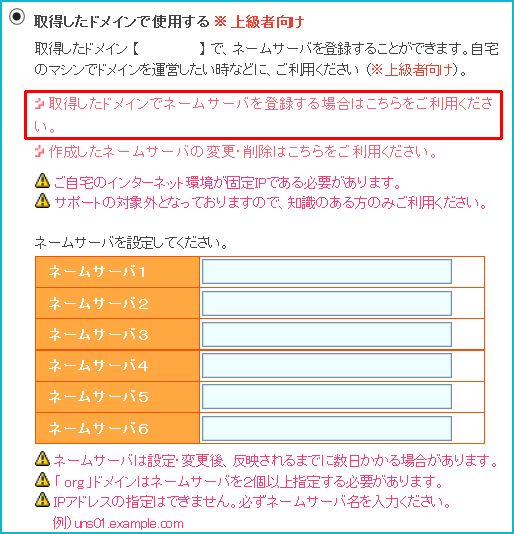 「取得したドメインで使用する 上級者向け」項目で、ネームサーバ1を設定します。