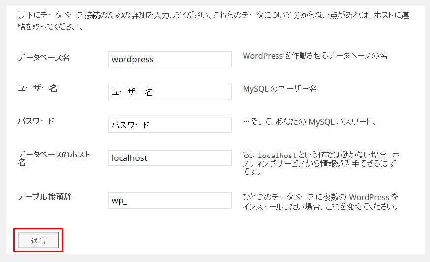 | GRANT ALL PRIVILEGES ON `wordpress`.* TO 'ユーザー名'@'localhost' |