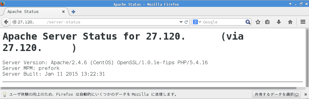 http://自分のIPアドレス/server-status へアクセスし表示されることを確認しました。