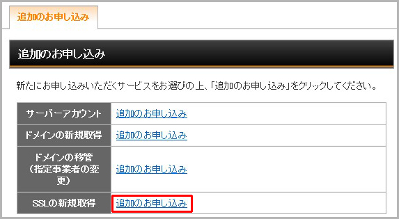 「SSLの新規取得」の「追加のお申し込み」をクリックします。