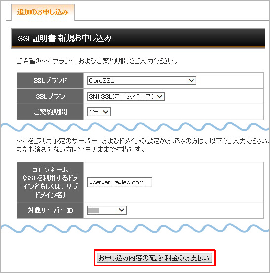 SNI SSL証明を取得するため、インフォパネルの「追加のお申し込み」をクリックします。