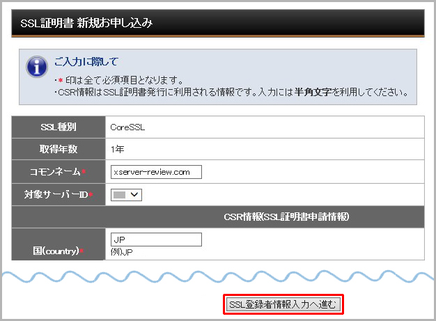 住所などの必要な情報を入力し「SSL登録者情報入力へ進む」をクリックします。