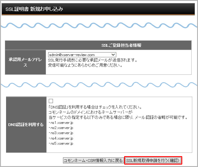 今回は「DNS認証を利用する」のチェックは外しました。