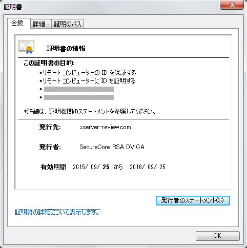 証明書です。発行先:ドメイン名、発行者:SecureCore RSA DV CAと